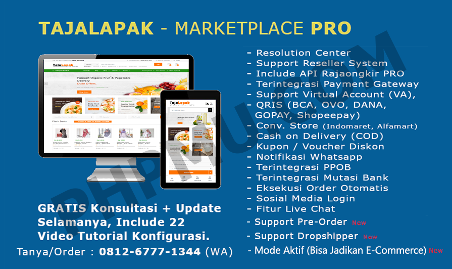 Terintegrasi API WA Gateway, PPOB, Mutasi Bank (BCA, BNI, BRI, Mandiri, Muamalat Mandiri Syariah, BCA API, BCA Giro. BNI Giro, BRI Giro, Mandiri Giro dan Cimb Niaga Corporate), Eksekusi Order Otomatis dengan Transfer Nominal Unik, Sosial Media Login, dan Rajaongkir PRO.Penjual : Umar Lapakers